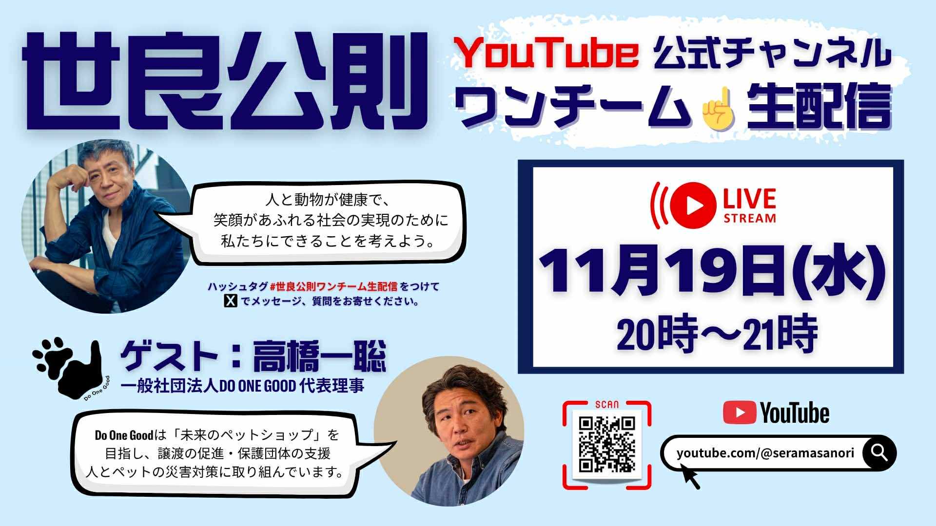 2025年11月19日(水)20:00から世良公則さんの YouTube公式チャンネルで配信される『ワンチーム生配信』 に、代表理事・髙橋一聡がゲストとして出演いたします。